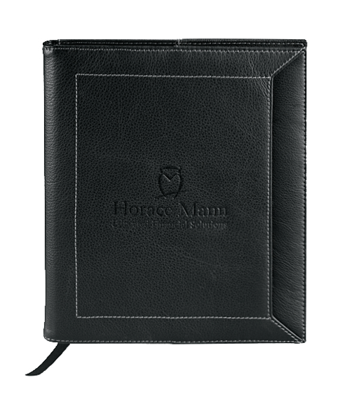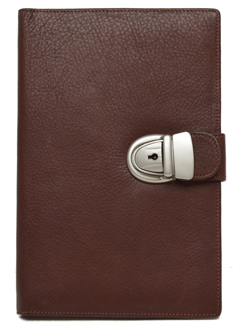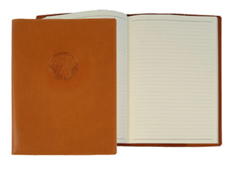 Made of pebble-grained leather. Ribbon page marker. 100 sheets of ruled 7" x 9" journal page insert. Business card holders. Mesh ID window. Pen loop.